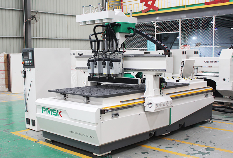 數(shù)控開料機(jī)的單頭打孔的主軸而言,速度能快一倍多,而且排鉆組可以根據(jù)不同的孔位大小自動(dòng)換打孔刀具進(jìn)行加工。在價(jià)格方面此款機(jī)型肯定是比四工序開料機(jī)要高些,也是柜體加工廠選擇比較多的一款機(jī)型。