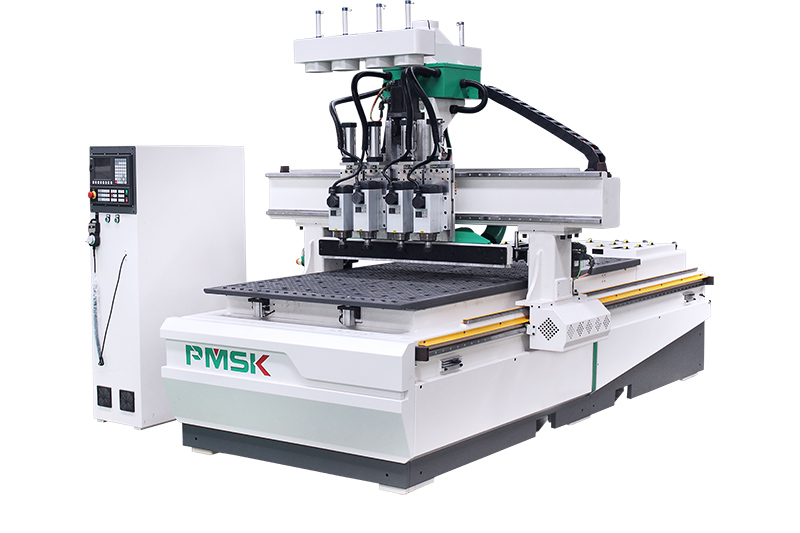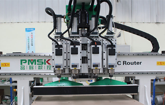 數(shù)控開料機,機頭部位搭載四個主軸,在加工櫥柜時主軸上裝載的刀具分別為6mm,8mm,10mm,15mm。在打孔時四個主軸氣動切換來解決所需孔位,在開槽和開料時兩個裝載6mm刀和8mm刀的主軸進行加工,同時